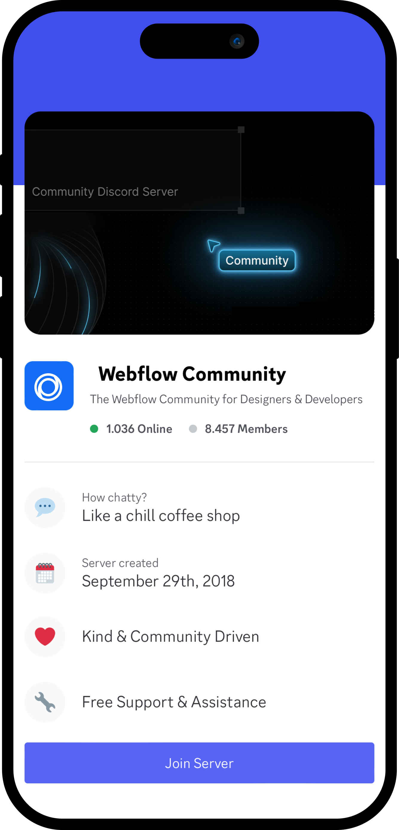 Download the Discord Mobile App for Android and IOS or join the Webflow Community Discord Server via Browser.